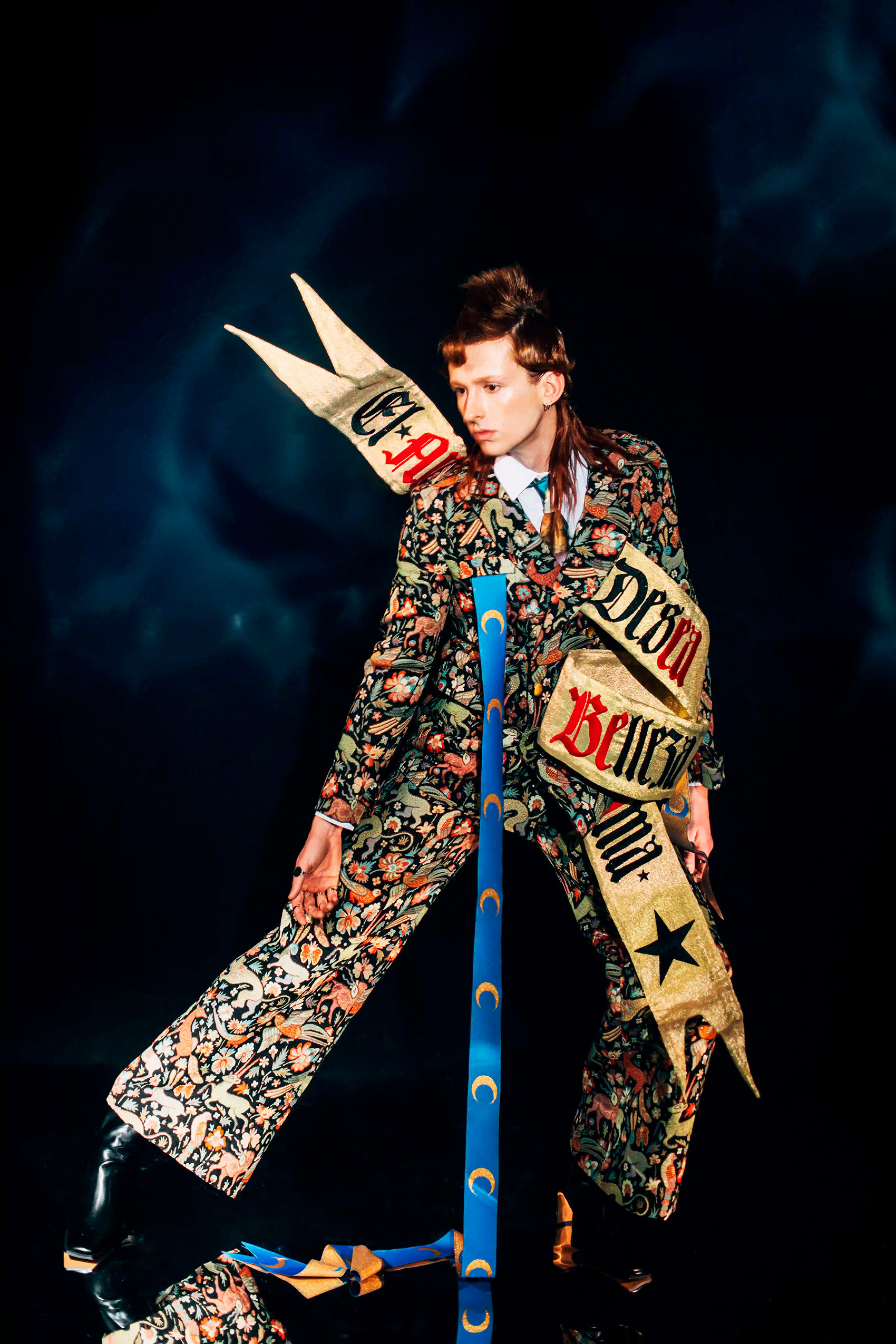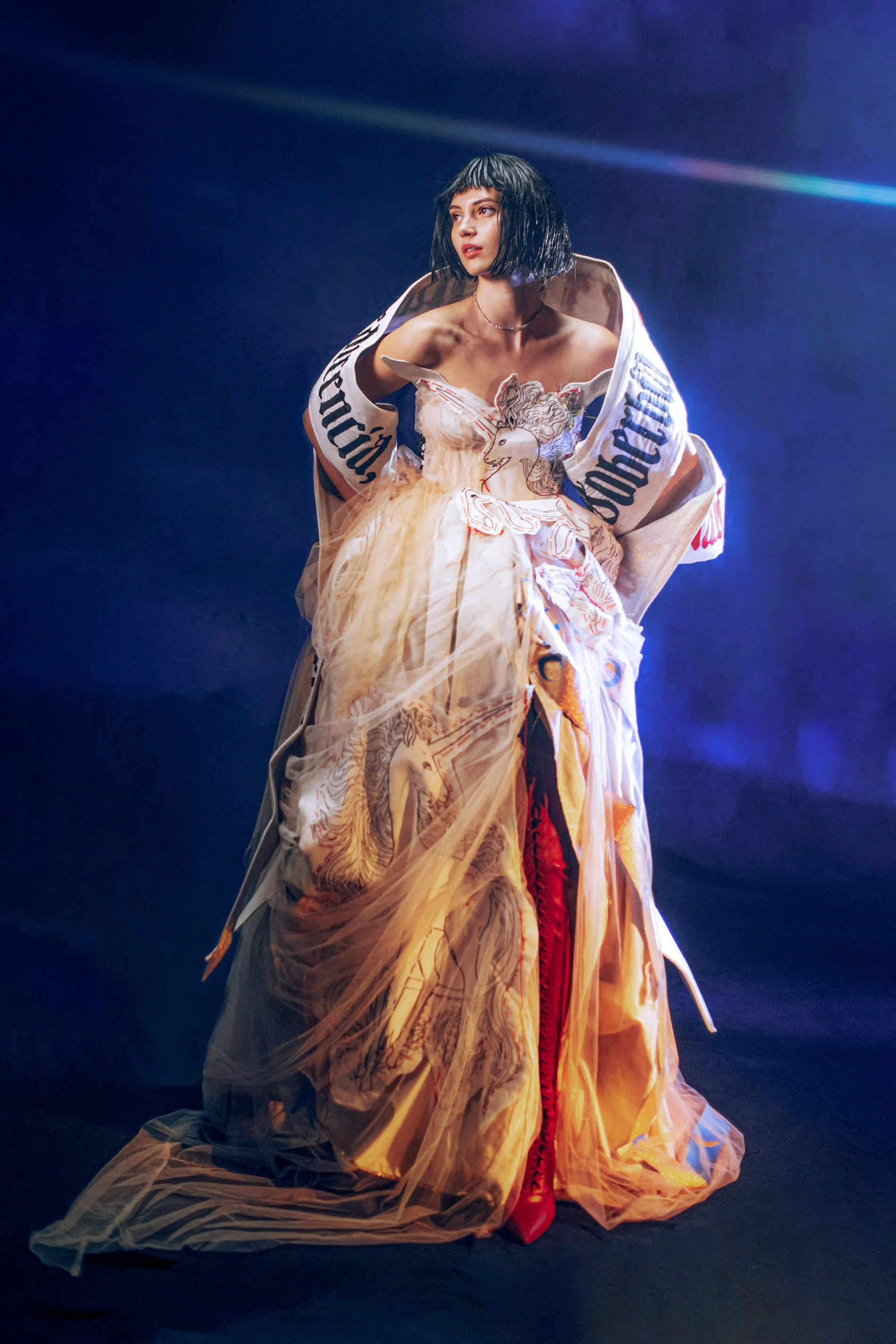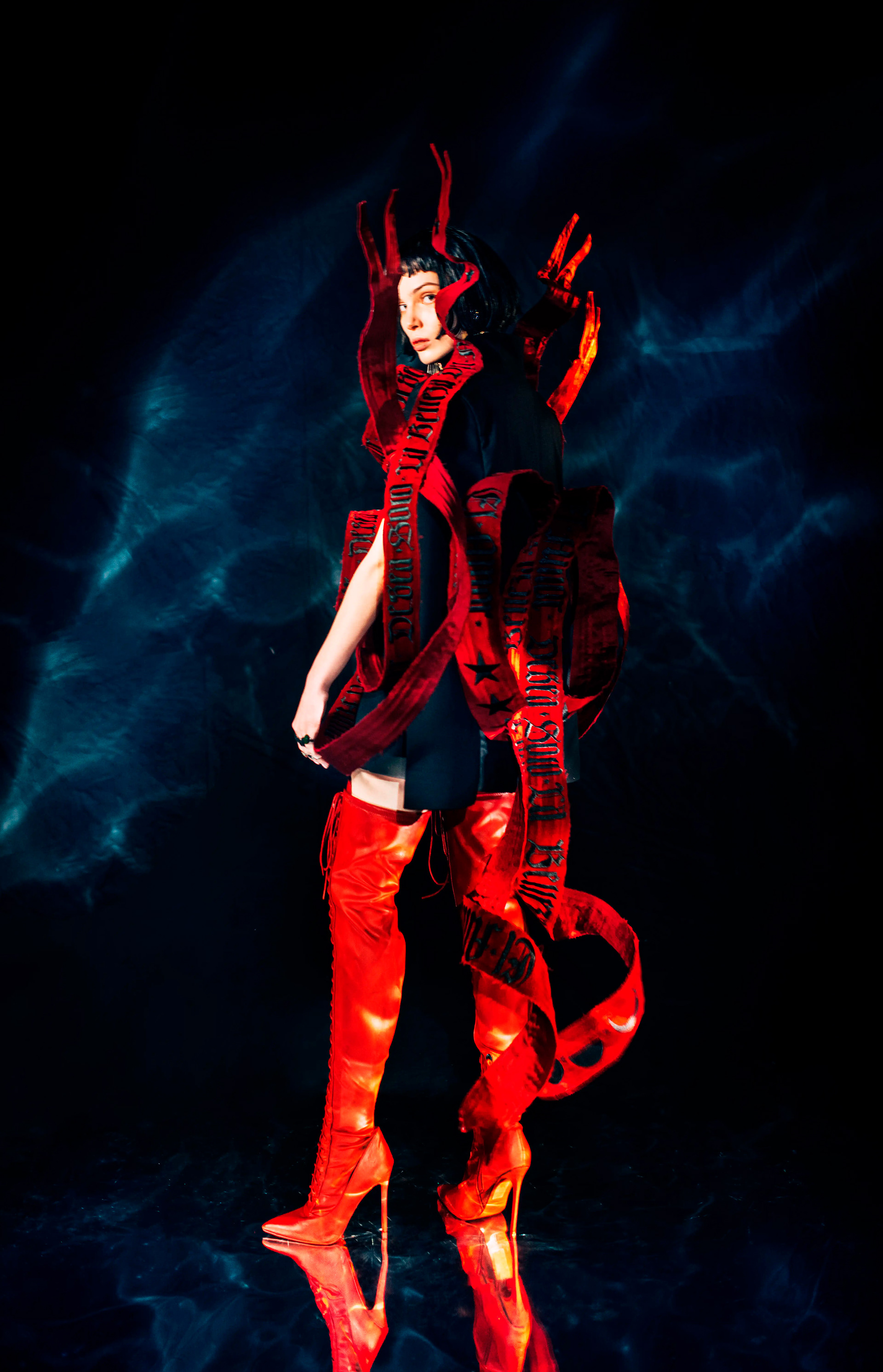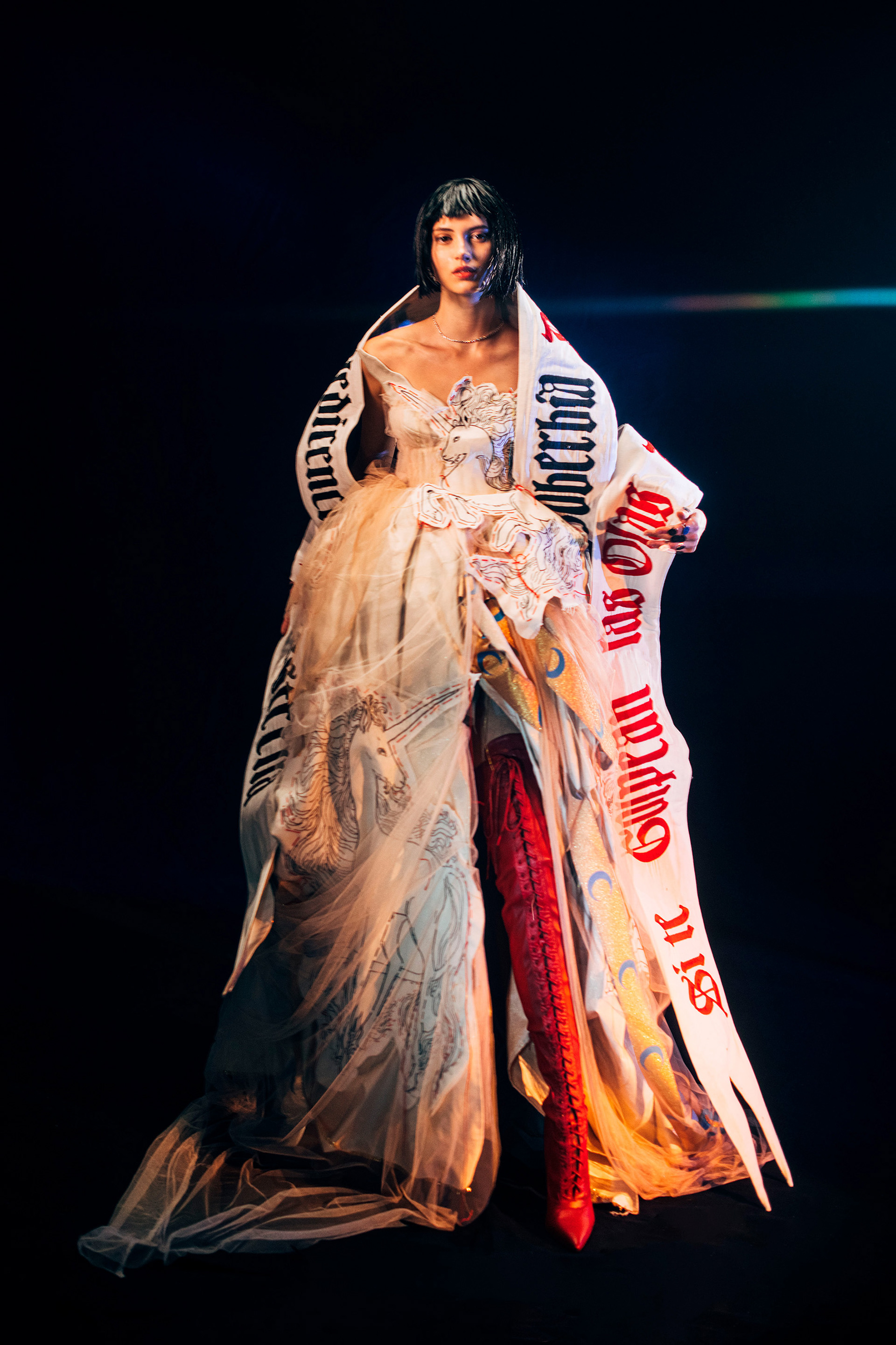 The moon and the stars is the romantic poem with which the lady expresses herself to her beloved. Taking also as reference the ancient religious manuscripts written by cloistered monks and the enriched writing of poems and the medieval gothic typography. The illumination the blooming of the flowers in the tapestries, and the most important representation in the collection: The myth of the unicorn that represents the hope the strength that we all at some point are looking for. We also need the purity of these mythological beings to add a little light to Humanity. The red, the black and white, the tule, the transparency, the illustrations taken from stories and magic tales are the main source and development of the garments that make a metamorphosis with past references taken to a new era of the 21st century.