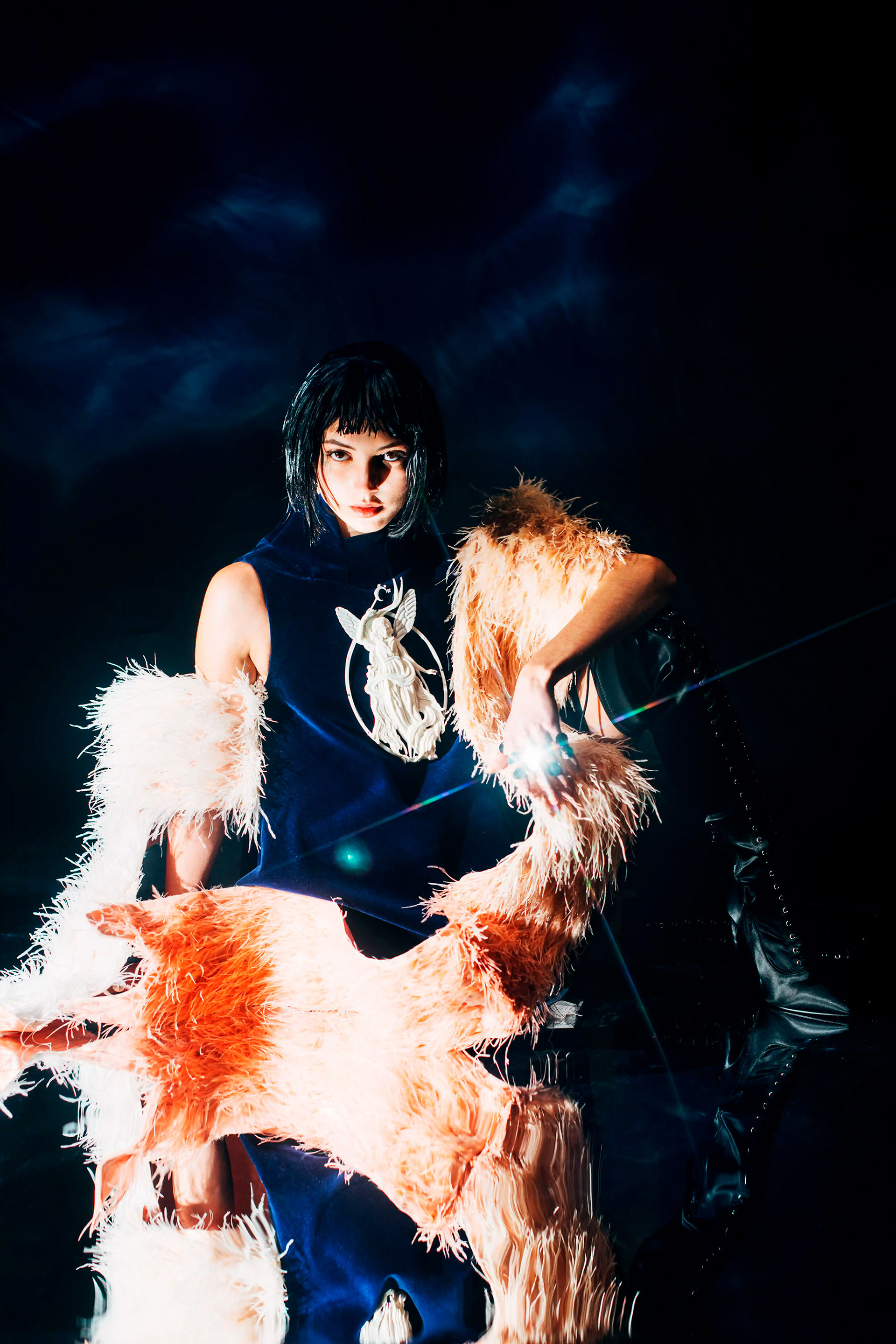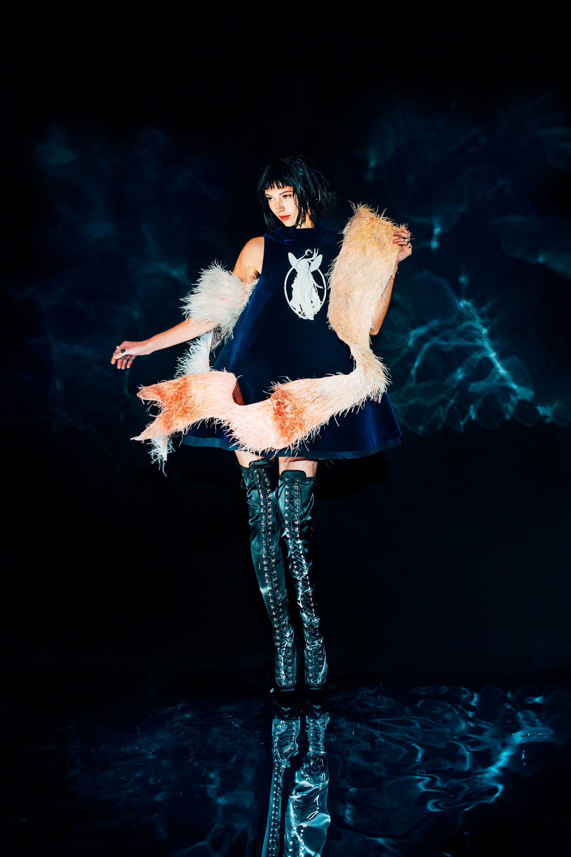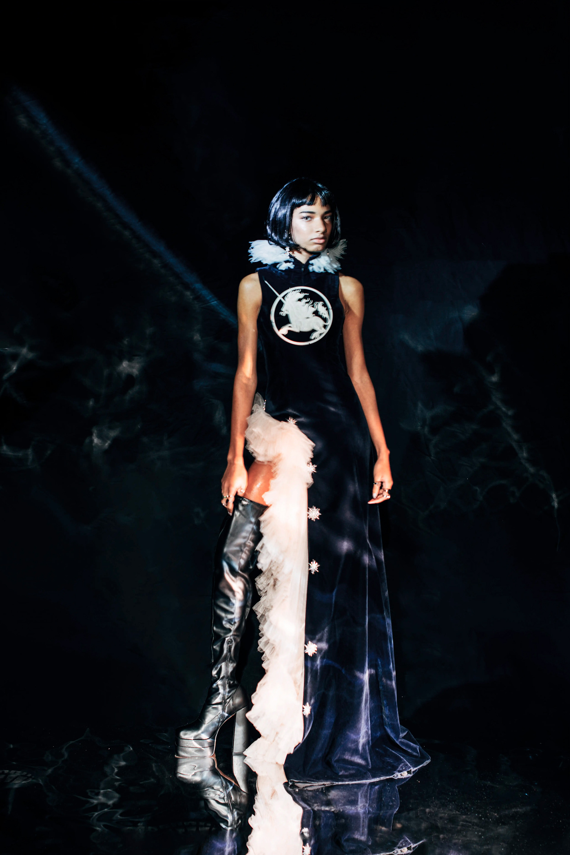 The moon and the stars is the romantic poem with which the lady expresses herself to her beloved. Taking also as reference the ancient religious manuscripts written by cloistered monks and the enriched writing of poems and the medieval gothic typography. The illumination the blooming of the flowers in the tapestries, and the most important representation in the collection: The myth of the unicorn that represents the hope the strength that we all at some point are looking for. We also need the purity of these mythological beings to add a little light to Humanity. The red, the black and white, the tule, the transparency, the illustrations taken from stories and magic tales are the main source and development of the garments that make a metamorphosis with past references taken to a new era of the 21st century.