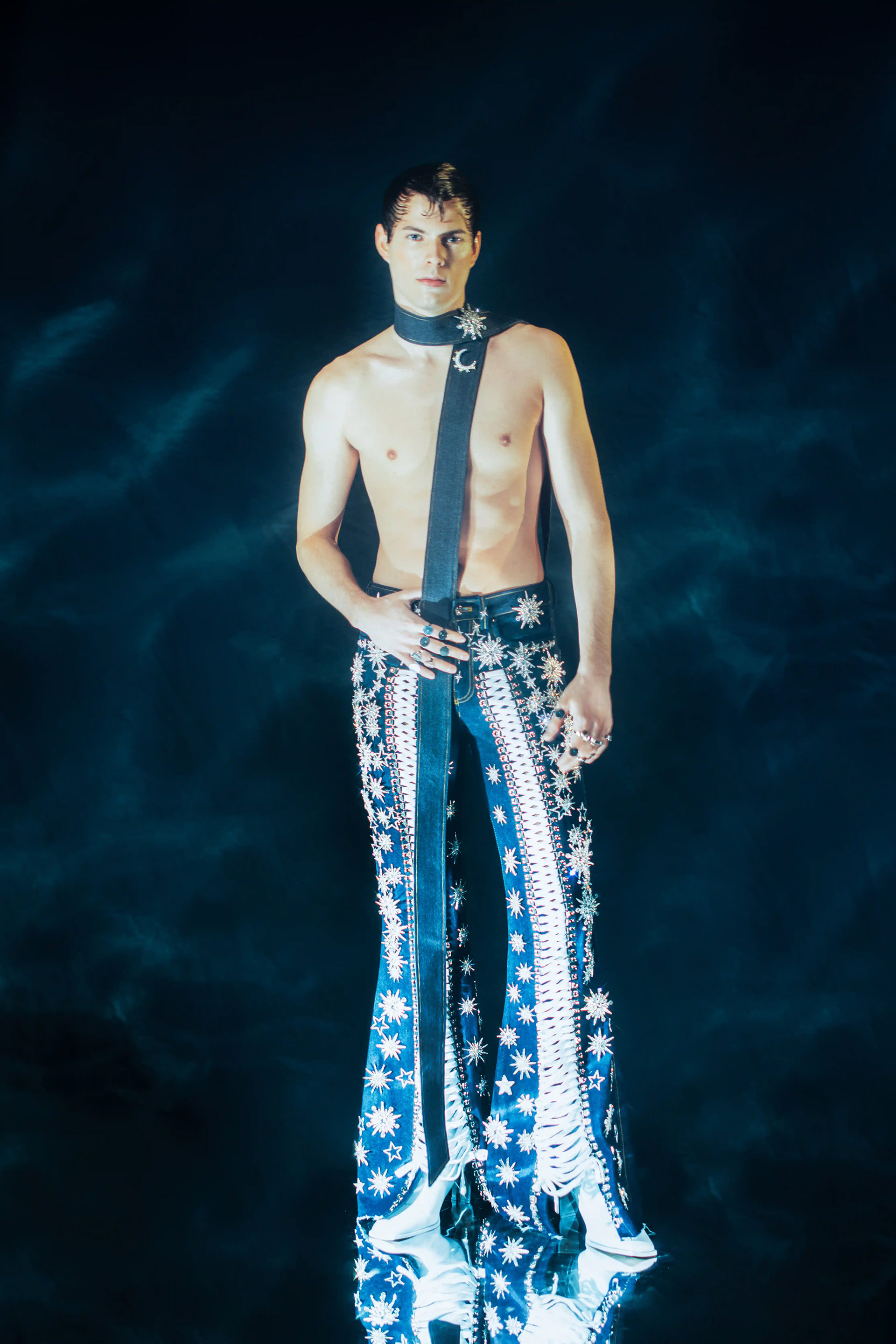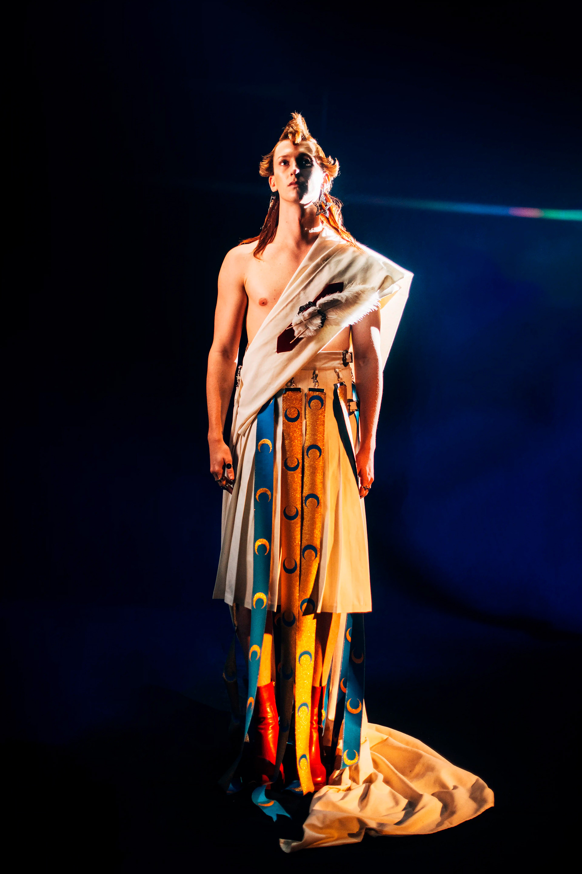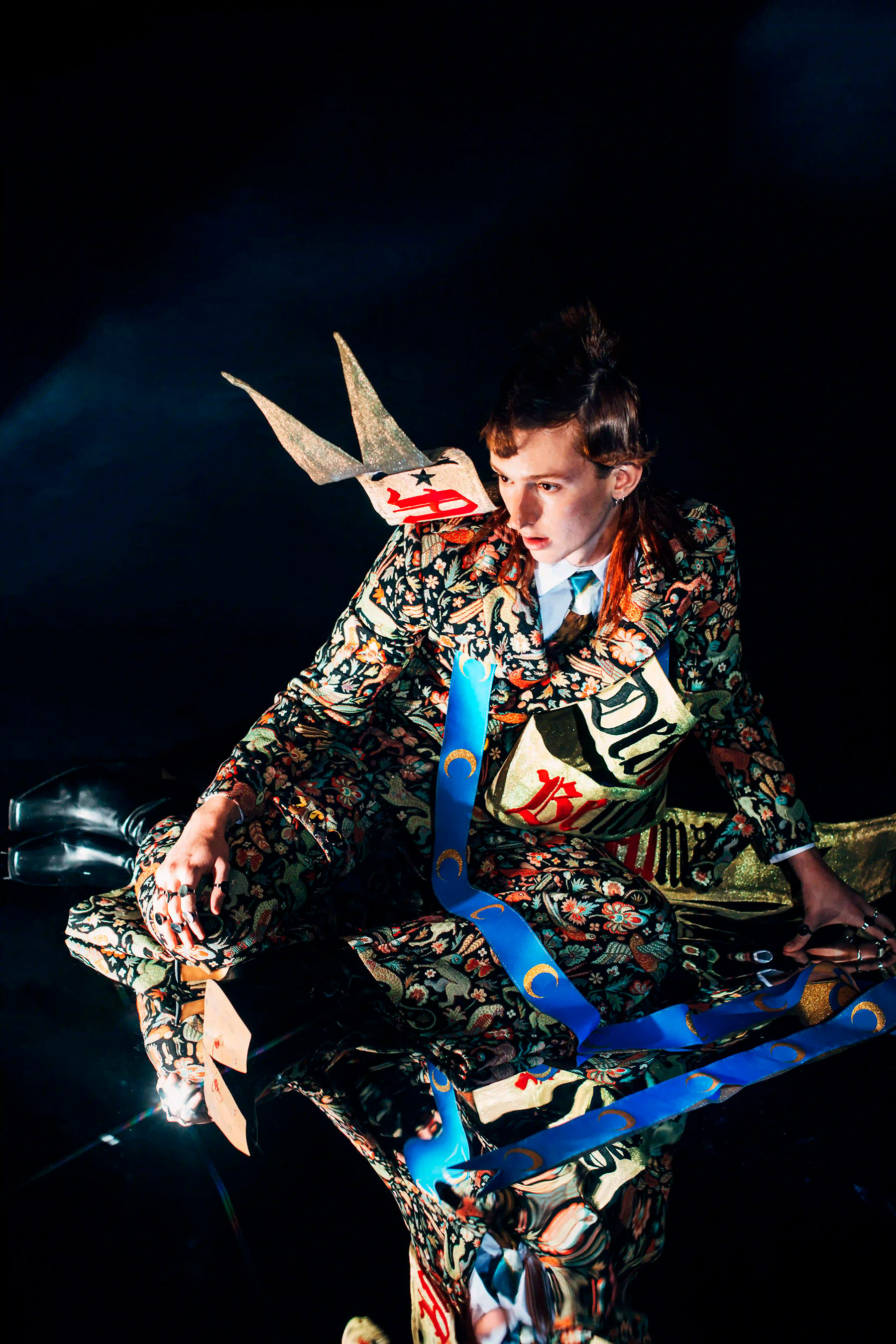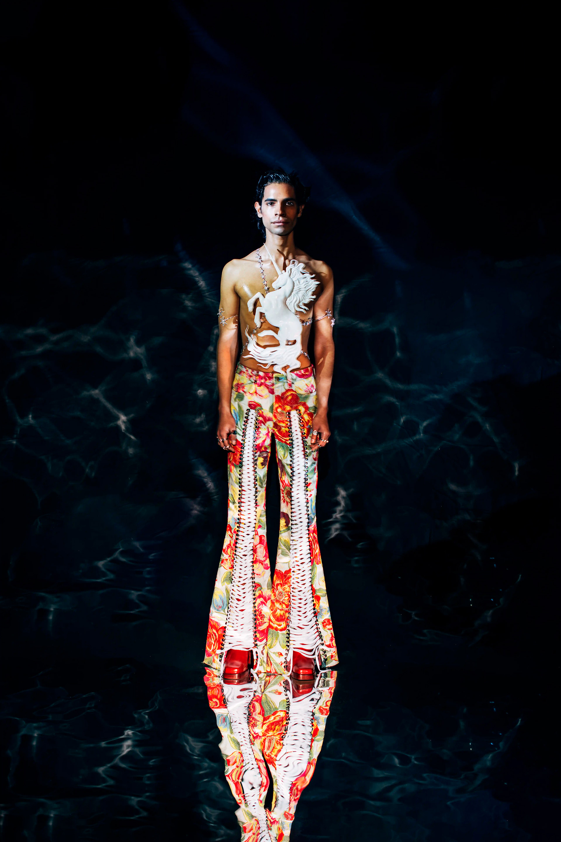 The moon and the stars is the romantic poem with which the lady expresses herself to her beloved. Taking also as reference the ancient religious manuscripts written by cloistered monks and the enriched writing of poems and the medieval gothic typography. The illumination the blooming of the flowers in the tapestries, and the most important representation in the collection: The myth of the unicorn that represents the hope the strength that we all at some point are looking for. We also need the purity of these mythological beings to add a little light to Humanity. The red, the black and white, the tule, the transparency, the illustrations taken from stories and magic tales are the main source and development of the garments that make a metamorphosis with past references taken to a new era of the 21st century.